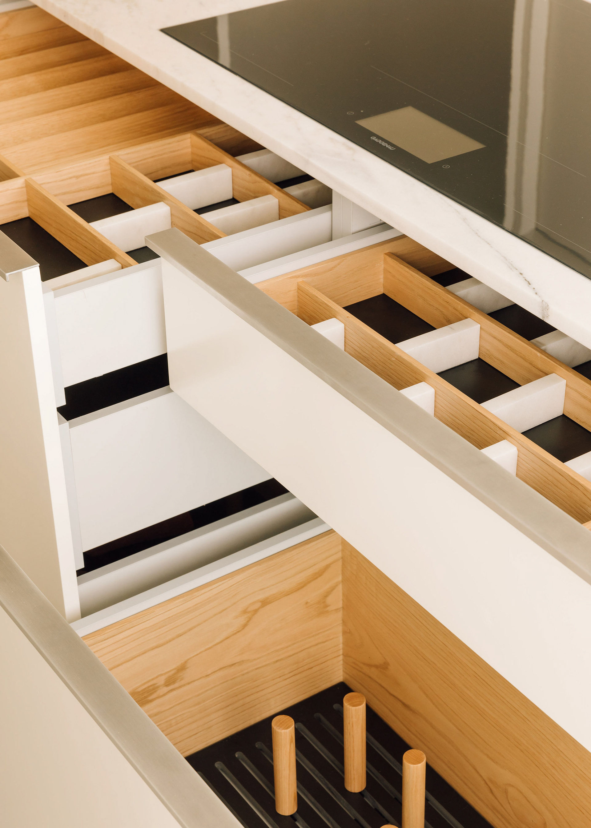 verso e reverso - madeira de castanho lacada e escovada a branco pelo exterior, e oleada à cor natural pelo interior; remates e detalhes de inox escovados pelo exterior e polidos no interior.