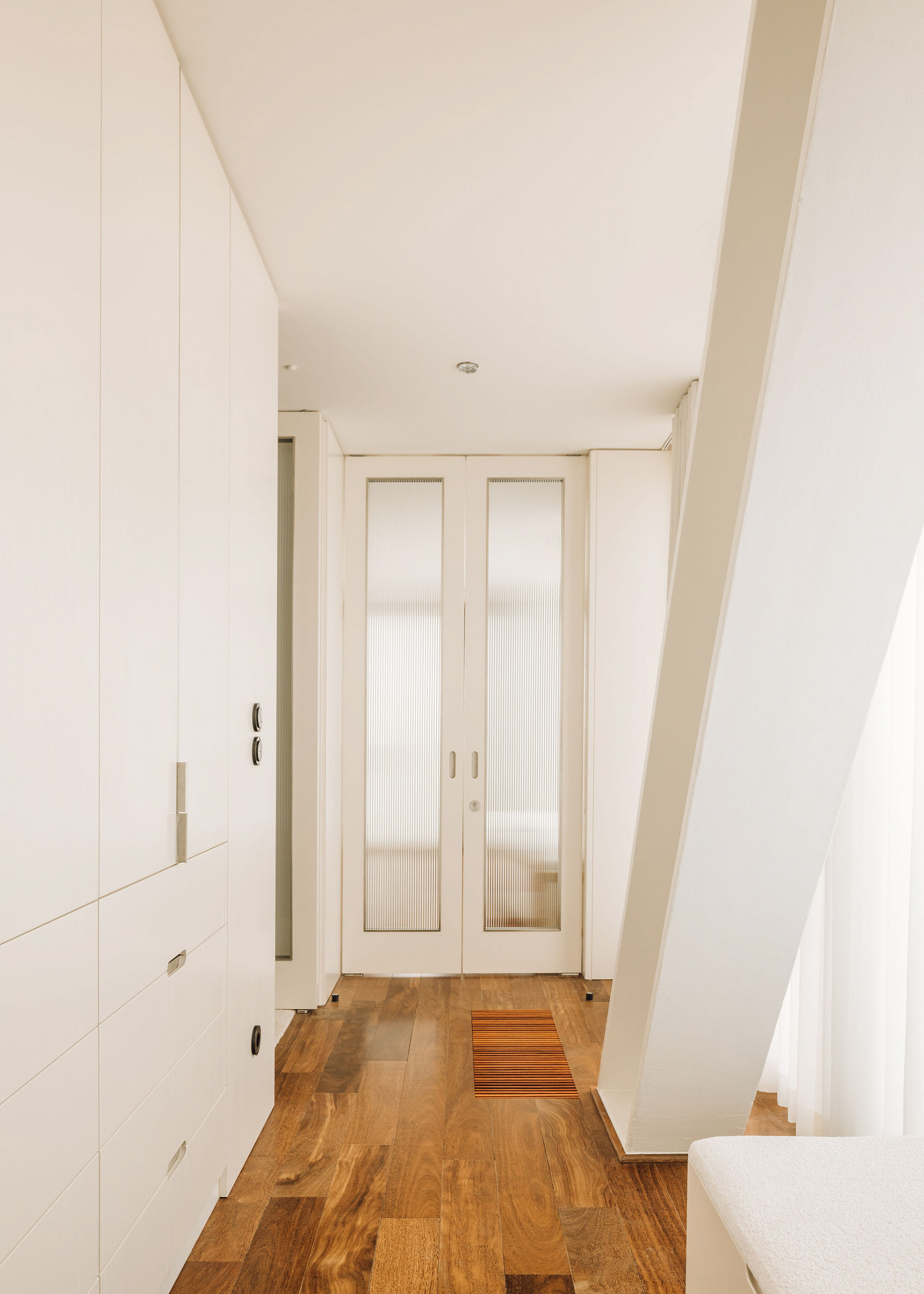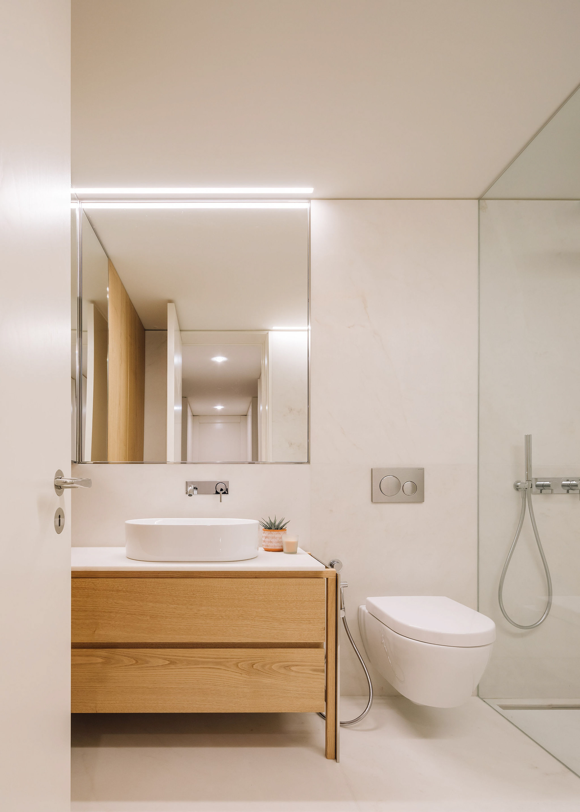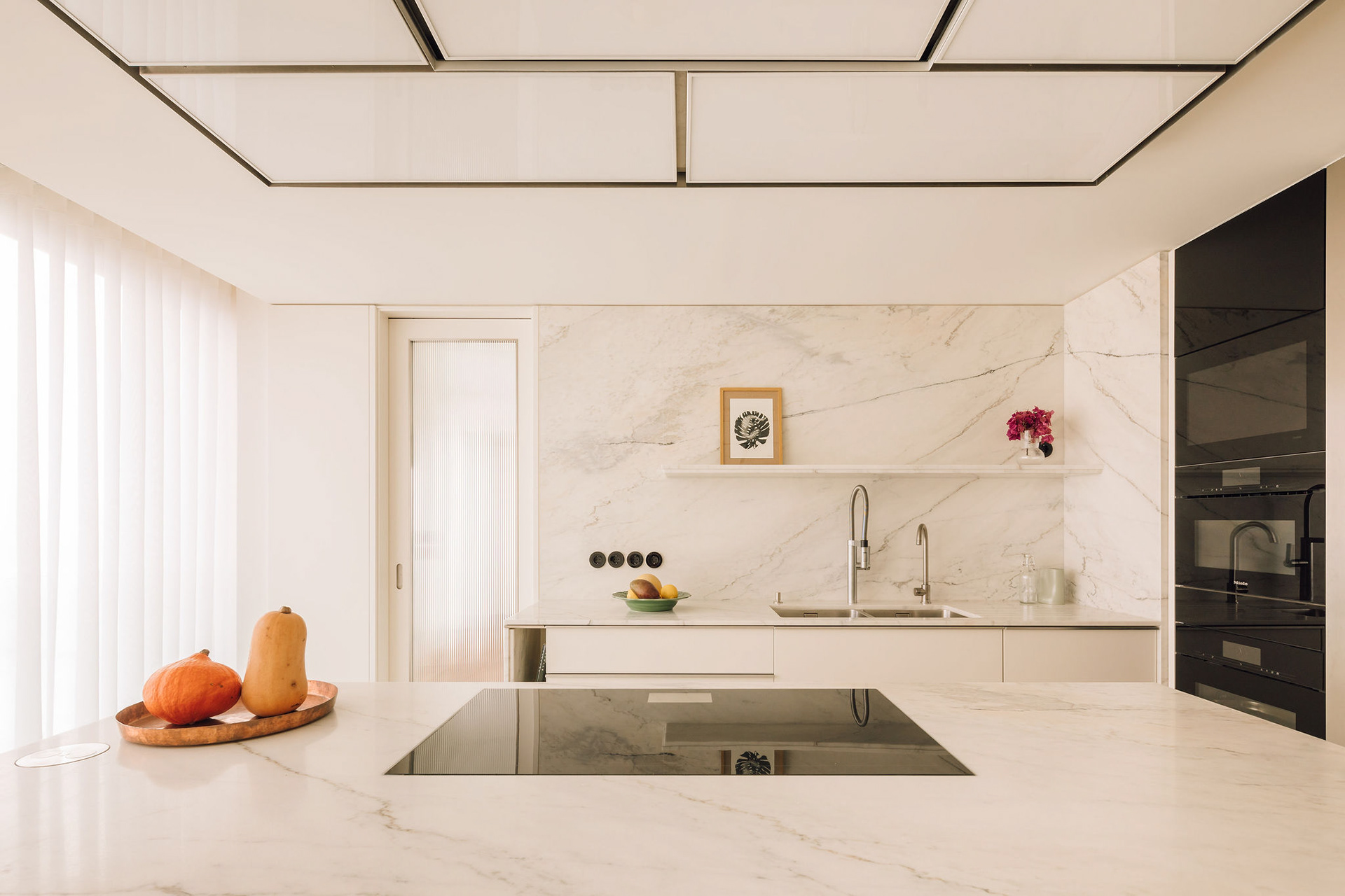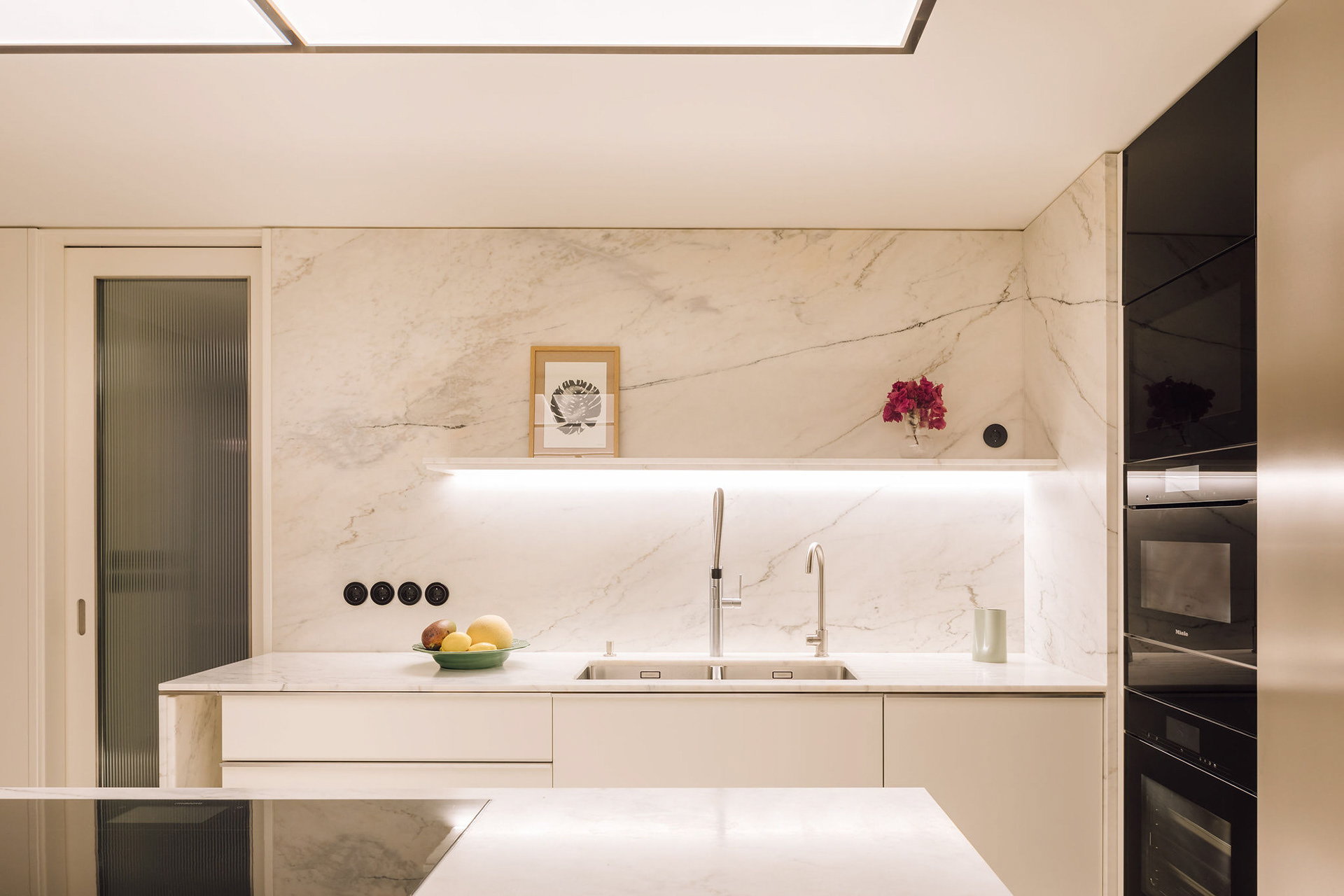 branco, mármore, inox, vidro e o soalho de sucupira para manter. acrescentam-se um barramento colorido à base de cal apagada e a madeira de castanho, contraponto à frieza dos primeiros, conferindo uma riqueza natural e plástica, uma textura táctil e confortável.