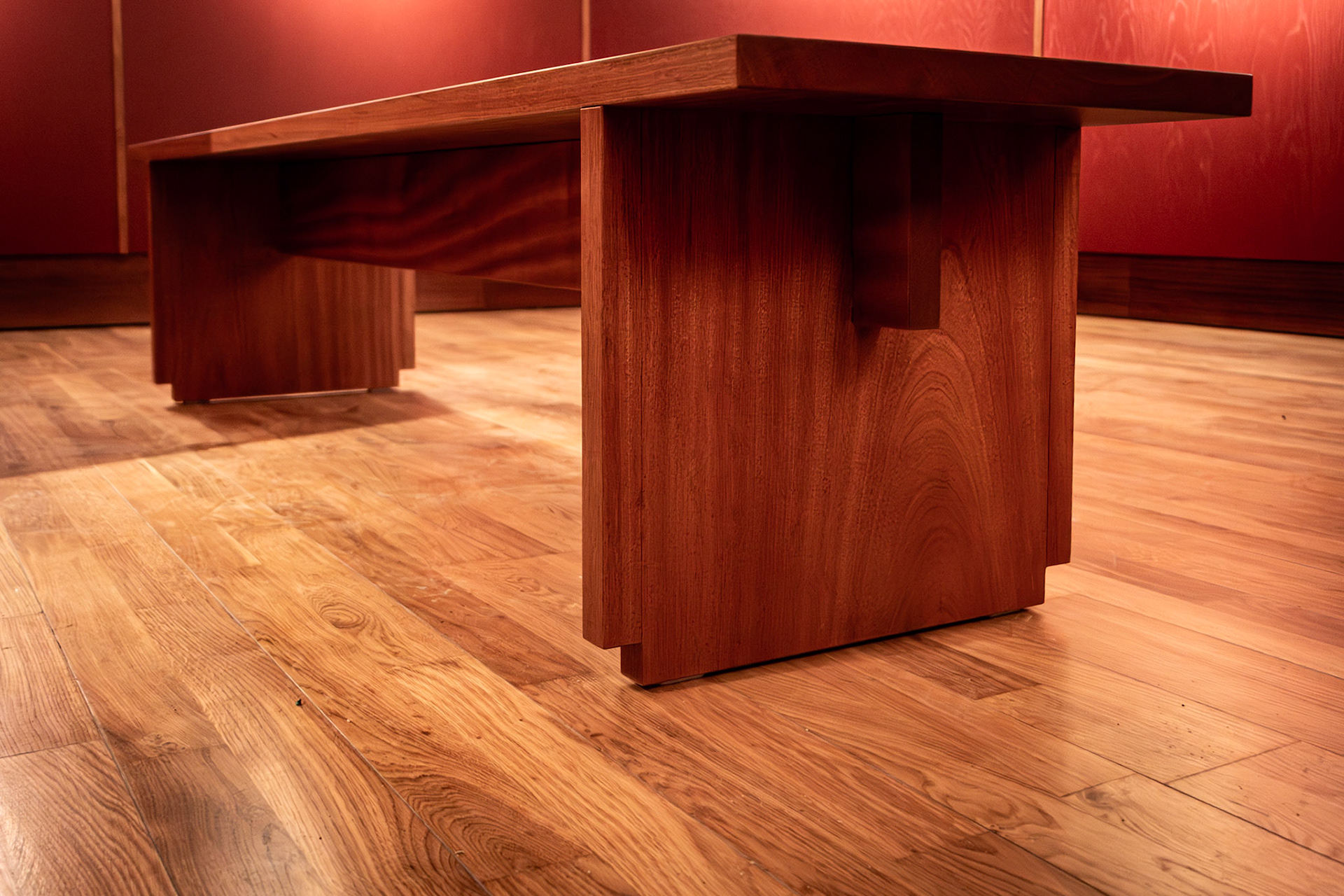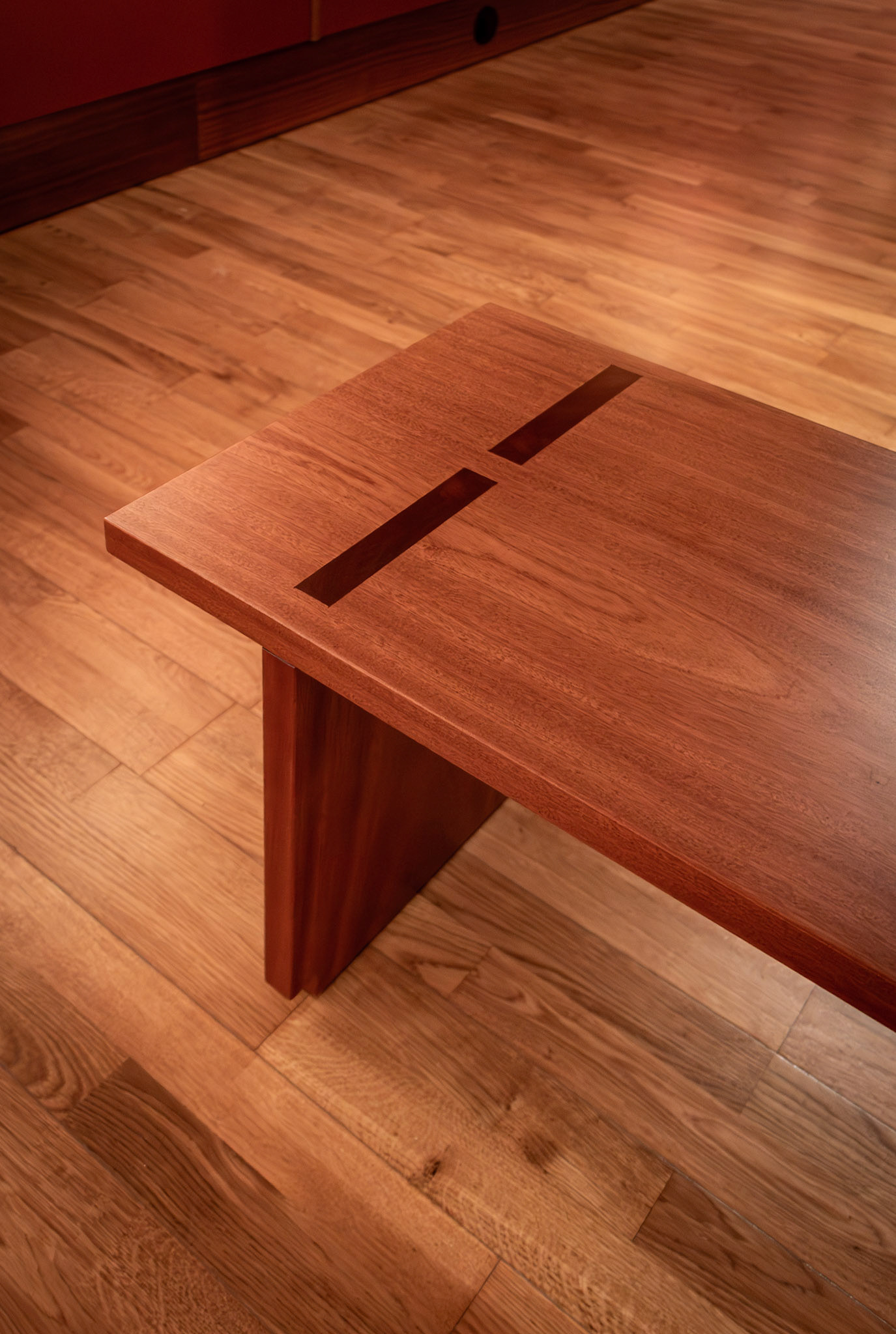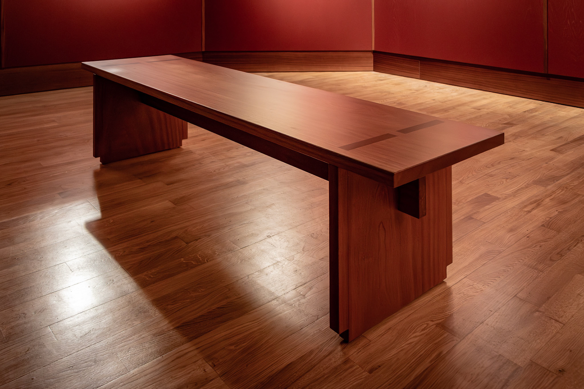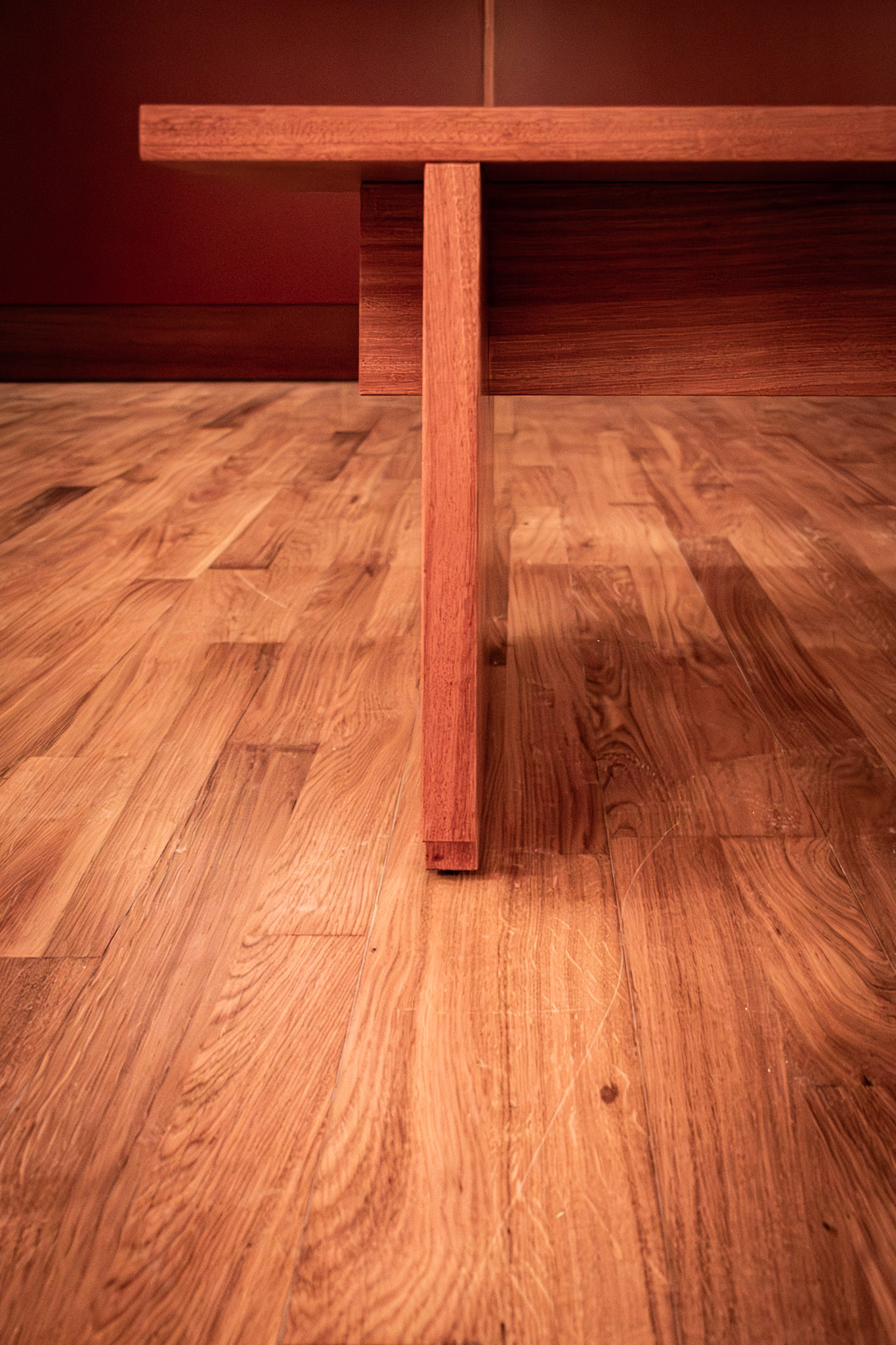 um banco para pontuar dois espaços de uma galeria, em madeira de mogno.